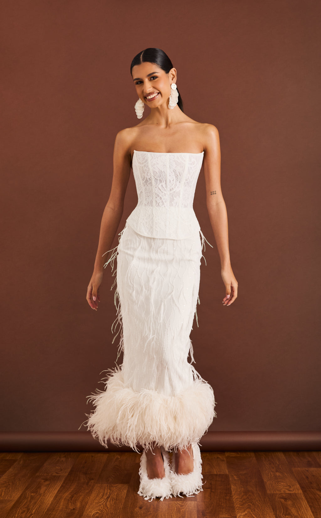 Designed for the dancefloor, the Anna Maria Skirt is crafted from an ivory soft crepe and floaty ostrich feathers along the hem. Every movement brings the design to life. It’s the perfect piece for a modern bridal look, reception outfit, or statement event moment.
